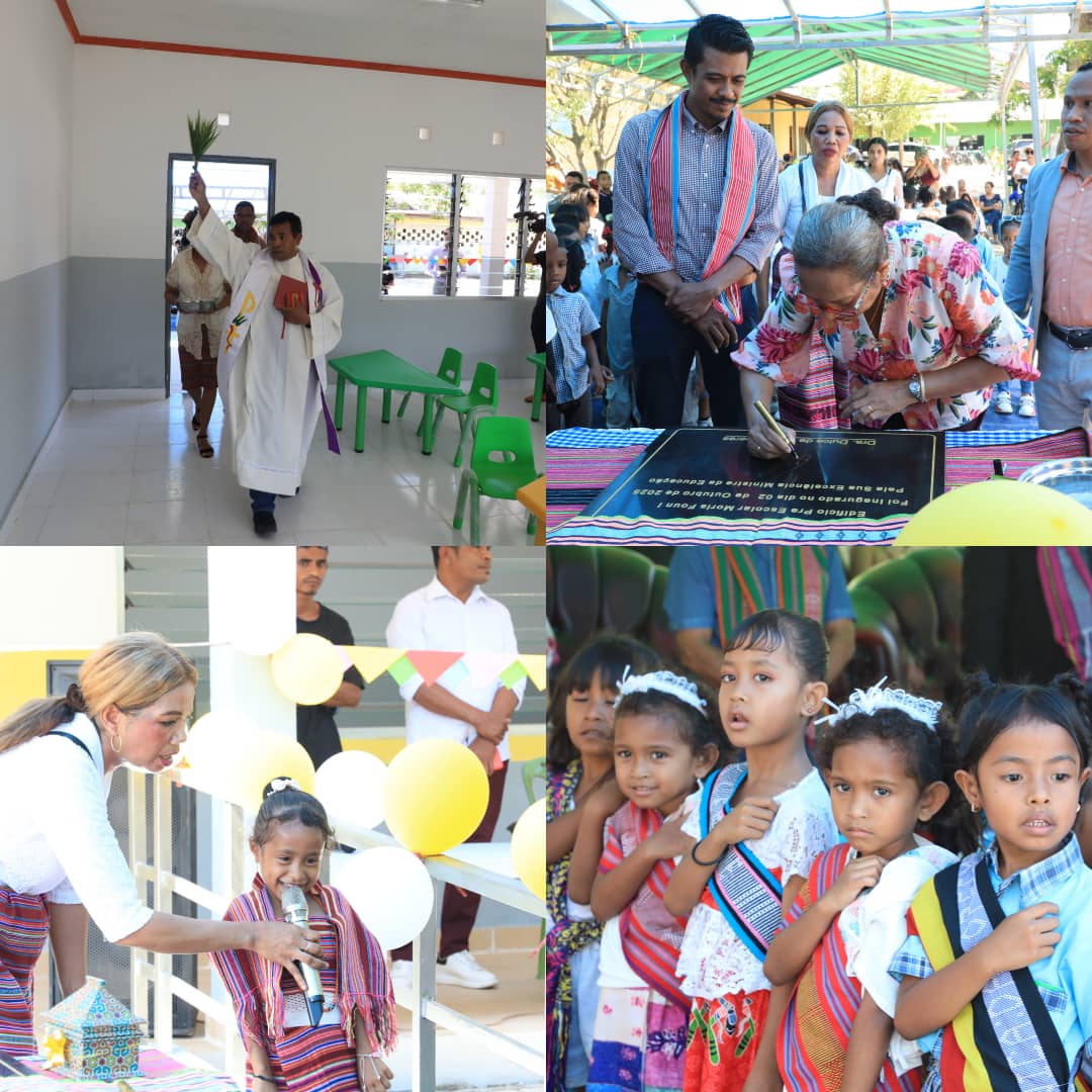 Sua Exelénsia Ministra Edukasaun, Dra. Dulce de Jesus Soares, hamutuk dirijente sira husi Ministériu Edukasaun no komunidade sira husi Suku Bairu-Pité, hala’o inagurasaun ba edifísiu foun Pré-Eskolar Moris Foun I, ne’ebé kompleta ho sala aula rua, sintina ba labarik feto no mane no mós dapur ba merenda eskolár.